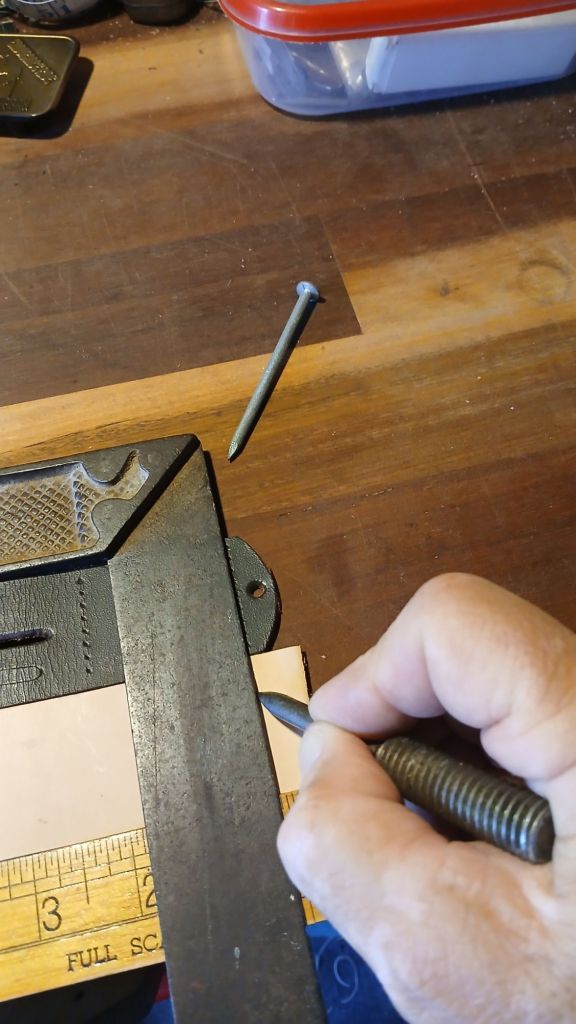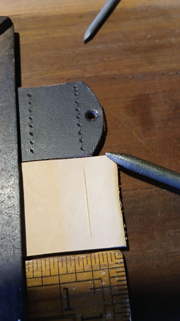 Marking the Leather is easy. Make yourself a Marking tool. You can smooth over the point of a nail or other item to make leather scribe. In the picture above you can see that I am using a home made marker. The important part is that the item is pointed enough to leave an impression without cutting or tearing the leather.